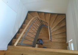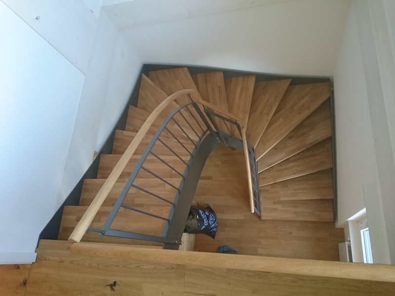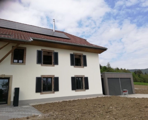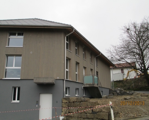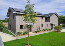 Neubau Mehrfamilienhaus. Fassade in Weisstanne Rift strukturgehobelt Greyback. Innenausbau, Türen & Fenster, Treppenbau, realisiert durch Messerli Holzbau AG