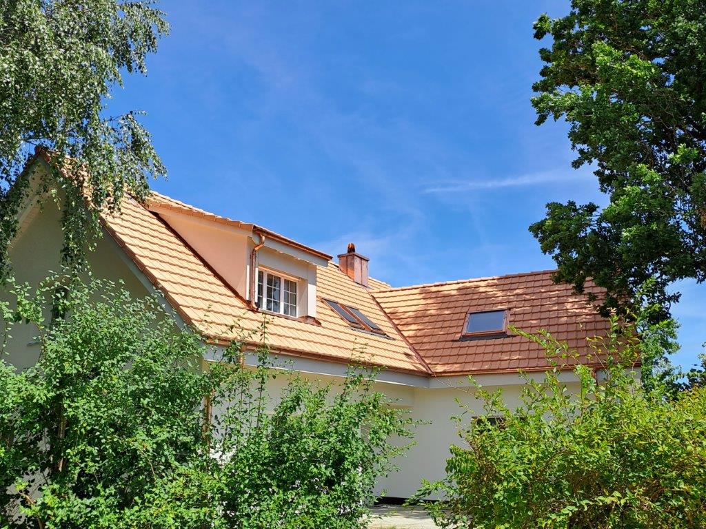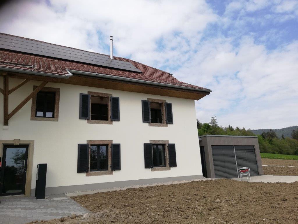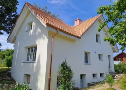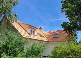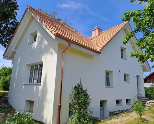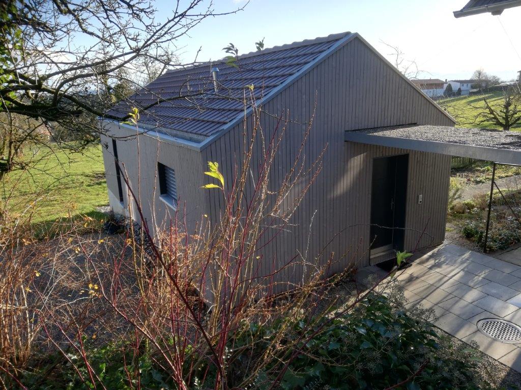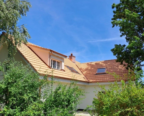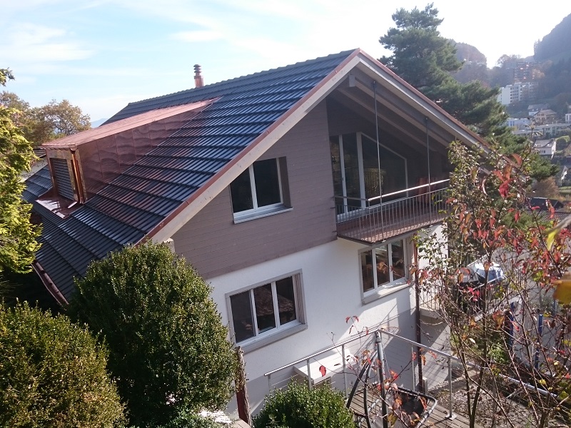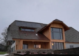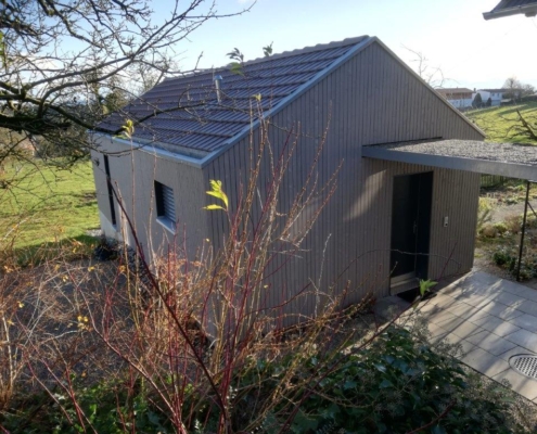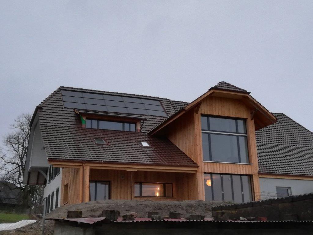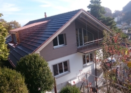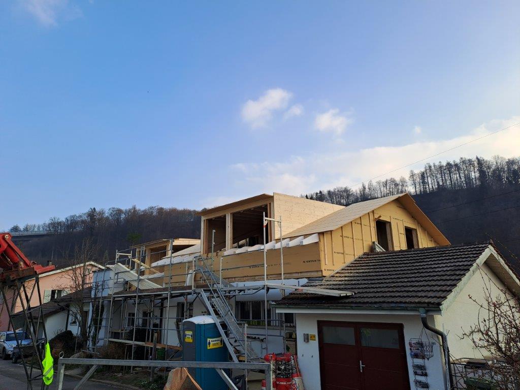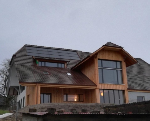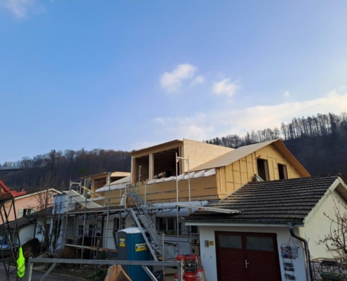Einfamilienhausaufstockung mit 2 Schlepplukarnen, Photovoltaik, Solaranlage, Dachterasse mit aufgehängtem Balkon.
